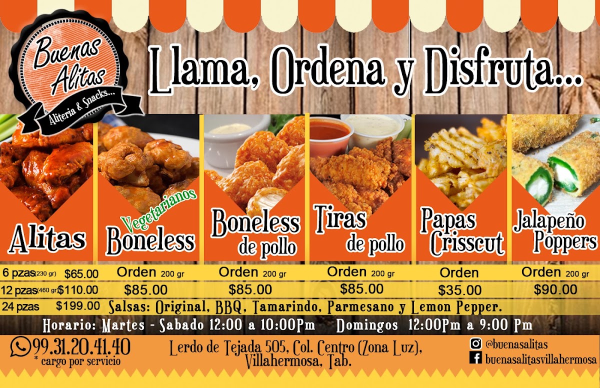 Welcome to Buenas Alitas, a charming wing haven located in the heart of Villahermosa, Mexico. Renowned for its enticing range of flavors, their menu is a must-explore for any wing lover. You can savor Alitas Picantes that pack a spicy punch or opt for the sweeter Alitas Dulces for a delightful balance. Craving something classic? The Alitas Buffalo and Alitas BBQ won't disappoint.